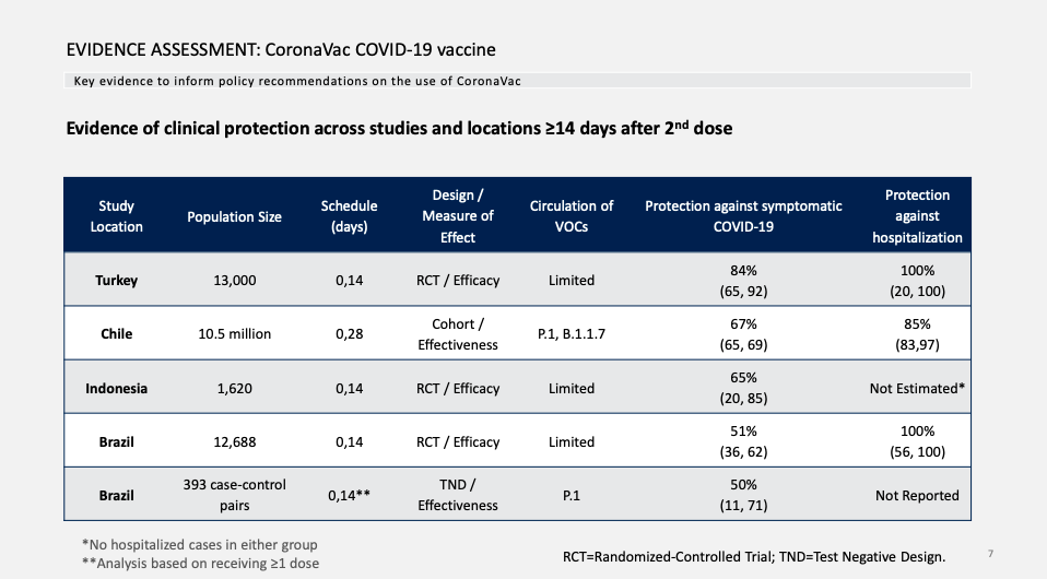 巴西:随机试验,预防有症状的新冠肺炎效力51%,预防住院效力100%。看新闻:目前考虑数值较低的原因是间隔时间短(14天)、接种的是医务人员。(这一句不是who报告原内容)