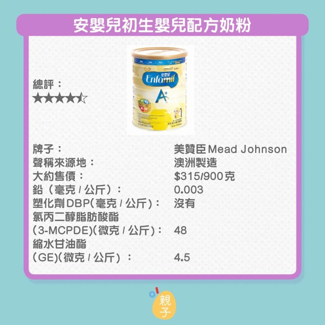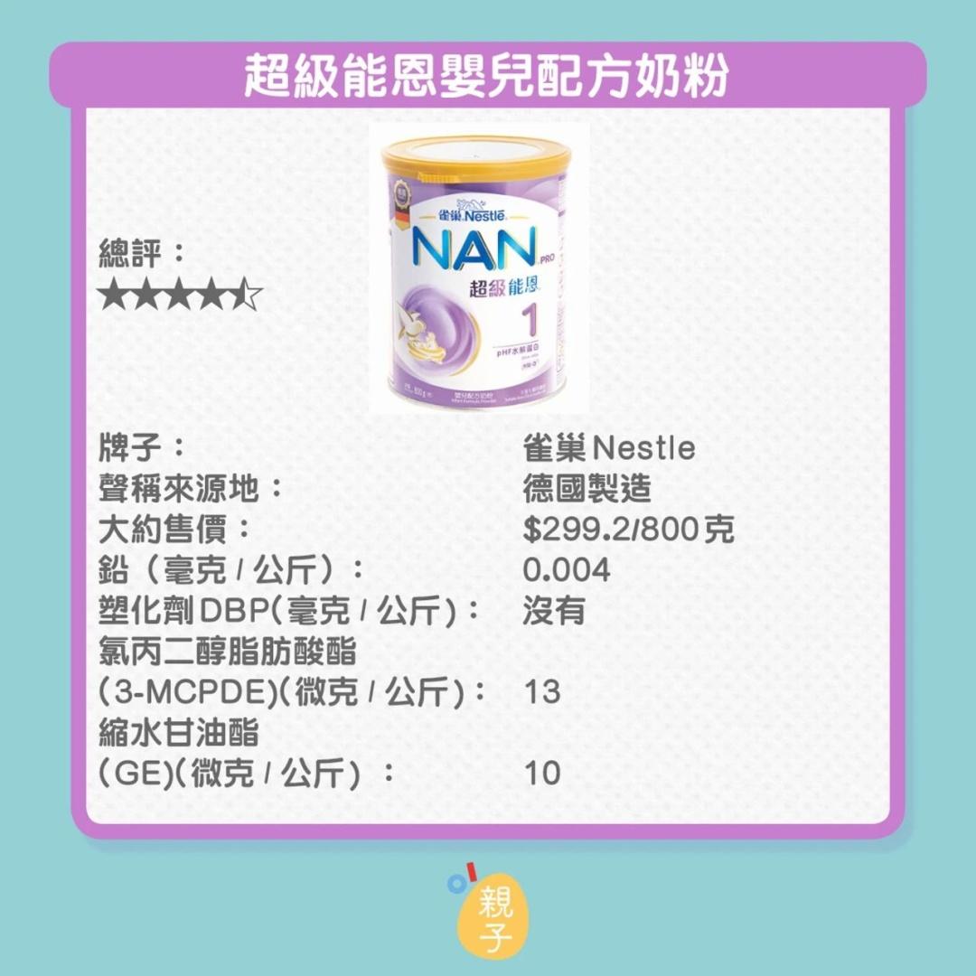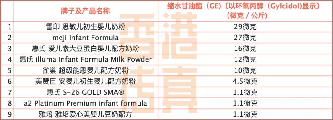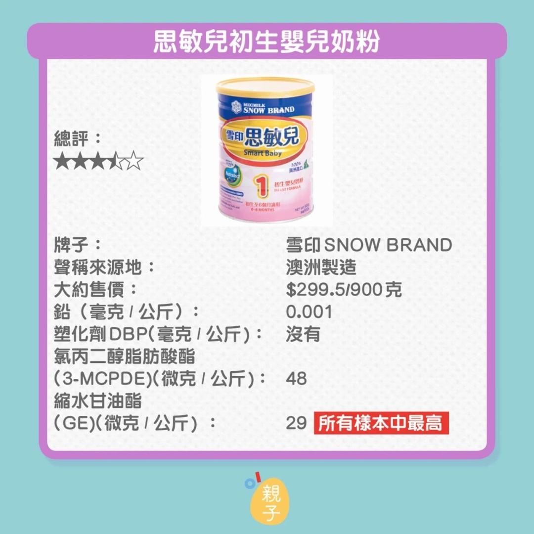 结果显示,15款密封包装婴儿配方奶粉均含有污染物氯丙二醇(3-MCPD),食用过量或损害肾功能或男性生殖能力。而当中含量最高的是“BELLAMY'S ORGANIC”,每公斤含有120微克3-MCPD,若按建议份量喂哺婴儿,会超出欧洲食物安全局的建议摄入限量。同时,有9款样本测出含有具基因毒性、致癌性的缩水甘油酯(GE),含量最高的样本为“雪印”,但低于欧盟规定的每公斤50微克上限。