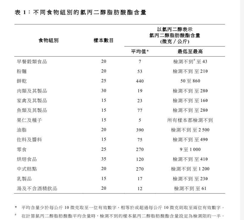 以“饼干、“油脂”、“零食”和“中式糕点的氯丙二醇脂肪酸酯平均含量较高,分别为每公斤440微克、390微克、270微克和270微克。具体数据见下表: